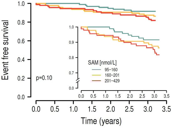 After stratifying the study cohort by their plasma SAM levels into tertiles, higher plasma SAM levels were significantly associated with the primary endpoint in univariate Kaplan–Meier survival analysis (p = 0.010).