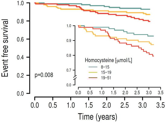 After stratifying the study cohort by their plasma homocysteine levels into tertiles, higher plasma homocysteine levels were significantly associated with the primary endpoint in univariate Kaplan–Meier survival analysis (p = 0.008).