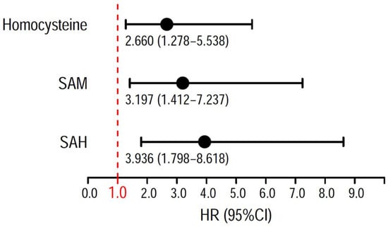 Forest plot: In univariate analysis, S-adenosylhomocysteine (SAH), S-adenosylmethionine (SAM) and homocysteine are significantly associated with the primary outcome.