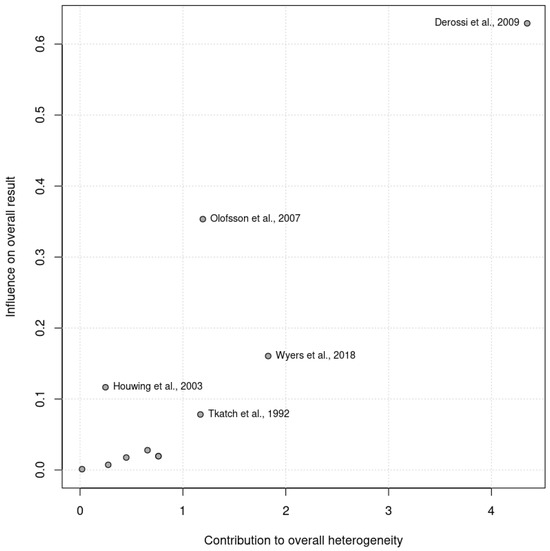 Baujat plot illustrating the contribution of individual studies to the overall heterogeneity (x axis) and their effect size (y axis). Studies further to the right contributed more significantly to heterogeneity.