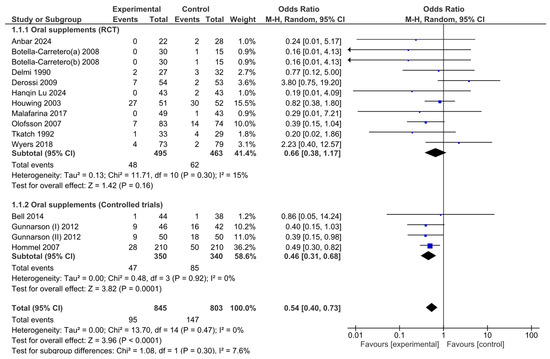 An analysis of the pooled results via the random effects model revealed that there were significant effects associated with oral nutritional interventions and the development of pressure ulcers in hip fracture patients. The pooled OR (95% CI) was 0.54 (0.40, 0.73). The overall effect size for the OR calculated as Z was 3.96 (p ≤ 0.0001; Figure 3).