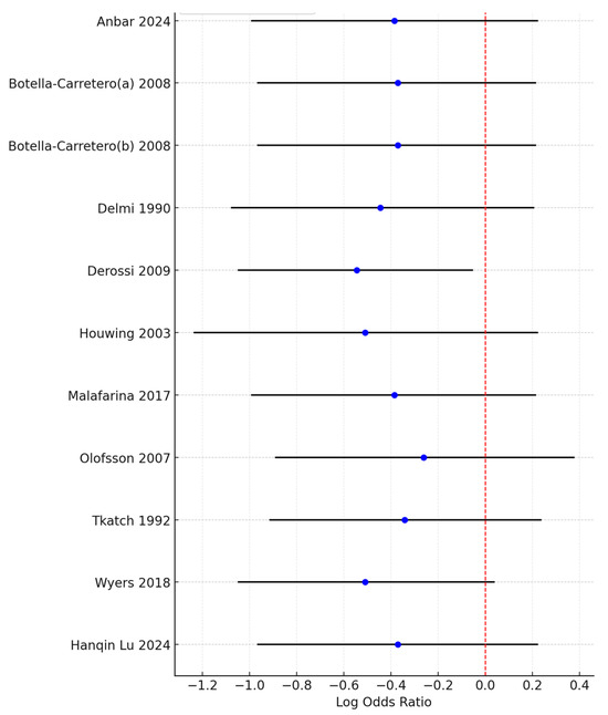 Forest plot from the leave-one-out sensitivity analysis showing the log odds ratio and 95% confidence intervals for each study when excluded from the meta-analysis. The red dashed line represents the null value (OR = 1), and the plot highlights the impact of individual studies on the overall results.
