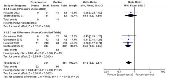 The results obtained were different when the risk of developing hip fracture in patients with category II ulcers was analyzed. The results from the only RCT analyzed were not statistically significant (OR = 0.58, 95% CI: 0.23–1.50). However, the nonrandomized controlled trials did (OR = 0.39, 95% CI: 0.23–0.65). The pooled analysis also revealed a significant result, indicating a decreased risk of developing category II ulcers in these patients (OR = 0.42, 95% CI: 0.27–0.67; Figure 6). Again, no significant heterogeneity was revealed by any of the analyses performed.