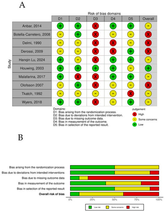 (A) Risk of bias per study. (B) Risk-of-bias summary plot.