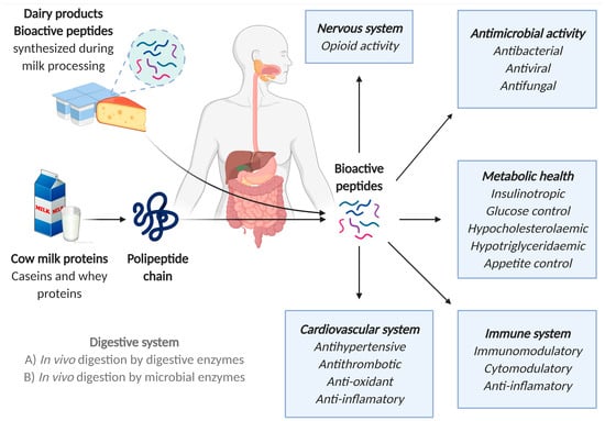 Schematic figure of the in vivo generation of bioactive peptides from milk proteins and their physiological functions. Figure based on [48]. Created with Biorender.com.
