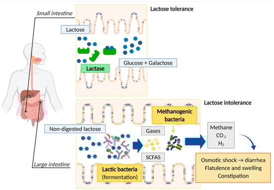 Lactose intolerance is a digestive disorder characterized by the inability of the GI tract to digest this milk disaccharide due to the deficiency or absence of β-galactosidase, commonly known as lactase, an enzyme produced in the small intestine and responsible for the hydrolysis of lactose. In the absence of lactose, the lactose reaches the colon intact, where it is consumed by the luminal microbiota, generating waste products such as hydrogen, carbon dioxide, methane, and short-chain acids, such as lactic, acetic, pyruvic, or butyric acids (Figure 2). This fermentation, the result of poor digestion, affects intestinal motility, causing the typical symptoms of lactose intolerance. Its clinical manifestations primarily manifest within the bowel, leading to symptoms such as abdominal pain, bloating, increased flatulence, and diarrhea. Importantly, lactose intolerance is not implicated as a causative factor in instances of rectal bleeding. The amount of lactose needed to induce these symptoms varies among individuals, but it also differs depending on the foods with which it is consumed and the degree of lactase deficiency, so it is not possible to set a single threshold [54].