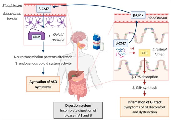 Autism spectrum disorder (ASD) involves a neuronal dysfunction that affects socialization, communication, imagination, planning and emotional reciprocity, and evidence of repetitive or unusual behaviors. The prevalence of ASD has increased steadily over the last few decades [113]. Although GI dysfunction in the form of chronic constipation, diarrhea, or abdominal pain is common among children with ASD, it is usually ignored or not recorded due to communication difficulties. The evidence suggests that in these patients, the GI structure is altered, and their intestinal permeability is increased by 25.60%, compared with 2.30% in healthy children [114]. This, together with the enzymatic deficiency they present, contributes to the development of abnormal immune reactions against food components. Interestingly, patients with ASD who follow a protein-restricted diet, specifically wheat and dairy-free diets, have significantly less permeability and an improvement in the associated neurological symptoms [114,115]. The mechanism by which these components of the diet, especially dairy proteins, aggravate the symptoms of ASD is unclear. However, it has been hypothesized that, after incomplete digestion of milk proteins, specifically β-caseins, opioid peptides called β-casomorphine 7 (β-CM7) are generated (Figure 3). These peptides can pass into the bloodstream owing to their high intestinal permeability, cross the blood–brain barrier, and interact with µ-opioid receptors involved in regulating aspects of social behavior. This binding alters neurotransmission patterns and increases the activity of the endogenous opioid system, which is related to the pathogenesis of ASD [114,116,117]. Simultaneously, the presence of β-CM7 in the intestinal lumen decreases the absorption of the amino acid cysteine (CYS), a necessary precursor for the synthesis of glutathione (GSH) tripeptide. The oxidative stress associated with low levels of GSH enhances the release of cytokines, contributing to inflammation of the GI tract and leading to GI discomfort and dysfunction, which are characteristic of patients with ASD [114].