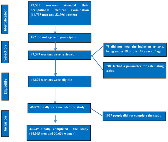 This research employed two studies, integrating a retrospective longitudinal analysis with a cross-sectional descriptive study. The study included a total of 44,939 healthcare professionals from various regions across Spain. Among the participants, 14,305 were men (31.8%) while 30,634 were women (68.2%). The sample was derived from individuals undergoing mandatory annual health evaluations required by their employers during the study period. The retrospective longitudinal study was conducted on a sample of workers for whom data on the studied variables (age, occupational category, smoking status, physical activity, and adherence to the Mediterranean diet) were available in 2010 and for whom the same variables were also available in 2019. The analysis aimed to assess how these variables influenced body fat and visceral fat levels under real-life conditions in this population. These are considered real-life conditions because no specific intervention was conducted by the researchers; instead, any observed changes were influenced by routine medical care from primary care physicians, social group interventions, personal decisions, and the influence of family and friends, among other factors. By comparing the same population over time, individuals who were under 30 years old in 2010 would be between 30 and 39 years old in 2019. However, for the purpose of comparison, they were still classified within the under-30 age group in 2019, as each age group was compared to itself a decade later. The same methodology was applied to the remaining variables.