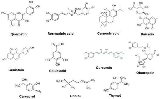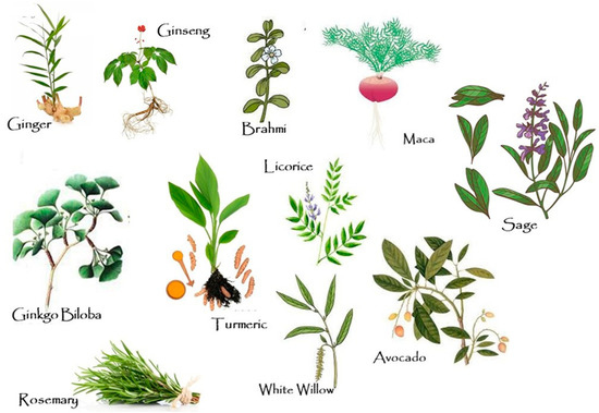 There are currently no drugs capable of effectively slowing down the progression of AD [21]. Numerous synthetic formulations, such as cholinesterase inhibitors and N-methyl-D-aspartate receptor antagonists (NMDAR) (including donepezil, rivastigmine, galantamine, and memantine) that are available on the market provide only symptomatic relief [22,23,24], as do those recently approved by the Food and Drug Administration (FDA), Aducanumab and Lecanemab, antibodies targeting Aβ [25,26,27]. This means that most therapies focus solely on symptomatic treatment, especially in the early stages of the disease [1]. Nowadays, there is an observable worldwide trend towards a more common therapeutic inclusion and recognition of herbal medicines that have long been used to alleviate certain cerebral disorders, including those inherent in AD, in some parts of the world [28,29,30]. Compared to synthetic drugs, herbal remedies are characterised by high long-term tolerance and low incidence of side effects such as sleep disorders, withdrawal syndromes, or toxic effects on other vital organs, all of which are frequent downsides of the synthetic alternatives [31,32]. Many conventional herbal and plant-based medicines contain chemical compounds with various beneficial pharmacological and biological properties [33,34] (Figure 1).