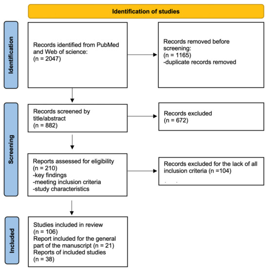 The initial search yielded 2047 articles. Duplicate records were removed before screening (n = 1165). Titles and abstracts were screened for relevance (n = 882), resulting in 210 full-text studies selected for detailed evaluation. After applying the inclusion criteria, 106 articles were included in the final review. To ensure comprehensive coverage, the reference lists of the selected articles were reviewed to identify additional relevant studies (n = 38). The paper used for the general part of the manuscript was also included (n = 21).