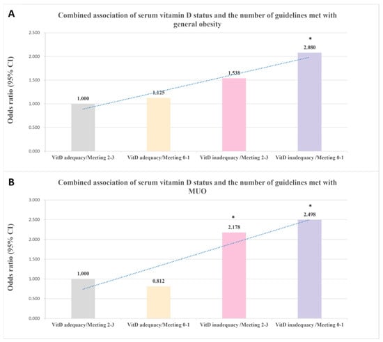 Combined associations of serum vitamin D status and the number of guidelines met with obesity. (A) General obesity; (B) MUO. The model adjusted for age, sex, pubertal status, maternal education, paternal education, parental obesity, parental history of metabolic disorders, family income, tobacco exposure, and blood sampling season. * p-value < 0.05. Abbreviations: CI, confidence interval; MUO, metabolic unhealthy obesity. VitD, vitamin D.