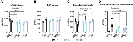 The d-ROMs test results showed that HMPA administration significantly decreased oxidative stress levels (Figure 1A, p < 0.001), while a trend toward a main effect of exercise (Figure 1A, p = 0.060) was observed. A significant interaction effect between HMPA administration and exercise was also observed (Figure 1A, p < 0.05). The post hoc analysis indicated that compared to the C group, d-ROM levels significantly decreased in both the L group (Figure 1A, p < 0.001) and H group (Figure 1A, p < 0.001). These results suggest that HMPA administration significantly reduces oxidative stress.