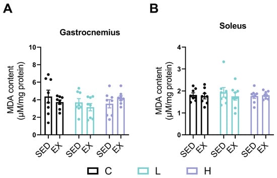 MDA is recognized as the final product of lipid peroxidation, reflecting the extent of oxidative damage in tissues [41]. No significant changes in the MDA content were found in the gastrocnemius and soleus muscles, as shown in Figure 2A,B.