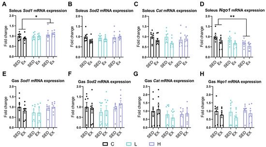 mRNA expression of (A) Sod1, (B) Sod2, (C) Cat, and (D) Nqo1 in the soleus, and (E) Sod1, (F) Sod2, (G) Cat, and (H) Nqo1 in the gastrocnemius. Sod, superoxide dismutase; Cat, catalase; Nqo1, NAD(P)H dehydrogenase, quinone 1; Gas, gastrocnemius; C group, vehicle control group; L group, low-dose HMPA administration group; H group, high-dose HMPA administration group; SED, sedentary; EX, exercise. The values are expressed as the mean ± SEM; * p < 0.05 and ** p < 0.001 compared with the C group.