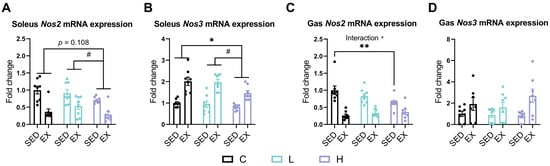 mRNA expression of (A) Nos2 and (B) Nos3 in the soleus. mRNA expression of (C) Nos2 and (D) Nos3 in the gastrocnemius. Nos2 (iNOS), nitric oxide synthase 2, inducible; Nos3 (eNOS), nitric oxide synthase 3, endothelial cell; Gas, gastrocnemius; C group, vehicle control group; L group, low-dose HMPA administration group; H group, high-dose HMPA administration group; SED, sedentary; EX, exercise. The values are expressed as the mean ± SEM. Interaction: interactive effect between HMPA administration and exercise; * p < 0.05 and ** p < 0.001, compared with the C group; # p < 0.05 compared with the H group.