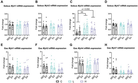 mRNA expression of (A) Myh1, (B) Myh2, (C) Myh4, and (D) Myh7 in the soleus. The mRNA expression of (E) Myh1, (F) Myh2, (G) Myh4, and (H) Myh7 in the gastrocnemius. Myh1, myosin, heavy polypeptide 1, skeletal muscle, adult; Myh2, myosin, heavy polypeptide 2, skeletal muscle, adult; Myh4, myosin, heavy polypeptide 4, skeletal muscle; Myh7, myosin, heavy polypeptide 7, cardiac muscle, beta; Gas, gastrocnemius; C group, vehicle control group; L group, low-dose HMPA administration group; H group, high-dose HMPA administration group; SED, sedentary; EX, exercise. The values are expressed as the mean ± SEM; ** p < 0.01 compared with the C group.