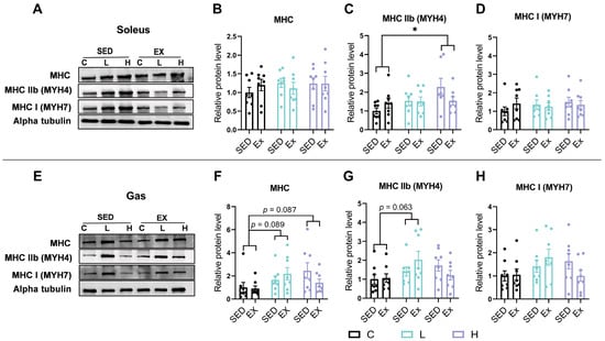 (A) Representative Western blot analysis of MHC, MHC IIb, MHC I, and alpha-tubulin in the soleus. Statistical graphs of (B) MHC, (C) MHC IIb, and (D) MHC I protein expression in the soleus. (E) Representative Western blot analysis of MHC, MHC IIb, MHC I, and alpha-tubulin in the gastrocnemius. Statistical graphs of (F) MHC, (G) MHC IIb, and (H) MHC I protein expression in the gastrocnemius. MHC, myosin heavy chain; Gas, gastrocnemius; C group, vehicle control group; L group, low-dose HMPA administration group; H group, high-dose HMPA administration group; SED, sedentary; EX, exercise. The values are expressed as the mean ± SEM; * p < 0.05 compared with the C group.