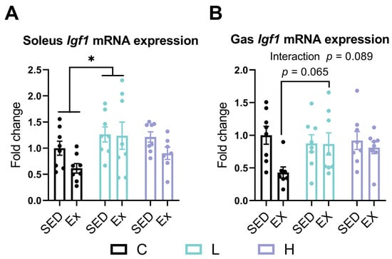 mRNA expression of (A) Igf1 in the soleus and (B) Igf1 in the gastrocnemius. Igf1, insulin-like growth factor 1; Gas, gastrocnemius; C group, vehicle control group; L group, low-dose HMPA administration group; H group, high-dose HMPA administration group; SED, sedentary; EX, exercise. The values are expressed as the mean ± SEM; Interaction: interactive effect between HMPA administration and exercise; * p < 0.05 compared with the C group.