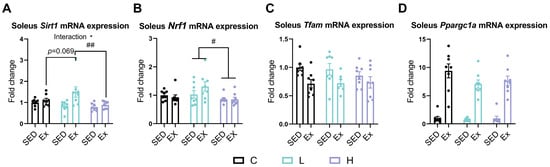 mRNA expression of (A) Sirt1, (B) Nrf1, (C) Tfam, and (D) Ppargc1a in the soleus. Sirt1, sirtuin 1; Nrf1, nuclear respiratory factor; Tfam, mitochondrial transcription factor a; Ppargc1a, peroxisome proliferator-activated receptor gamma coactivator 1-alpha; C group, vehicle control group; L group, low-dose HMPA administration group; H group, high-dose HMPA administration group; SED, sedentary; EX, exercise. The values are expressed as the mean ± SEM; Interaction: interactive effect between HMPA administration and exercise; * p < 0.05; # p < 0.05 and ## p < 0.01 compared with the H group.