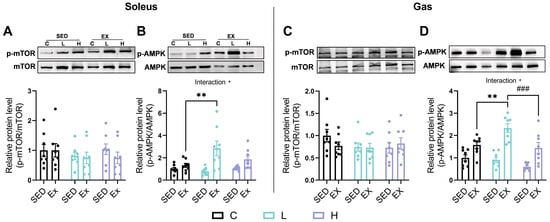 Western blot analysis of the phosphorylation of (A) mTOR and (B) AMPK in the soleus. Western blot analysis of the phosphorylation of (C) mTOR and (D) AMPK in the gastrocnemius. AMPK, AMP-activated protein kinase; p-AMPK, phosphorylated AMPK; mTOR, mammalian target of rapamycin; p-mTOR, phosphorylated mTOR; Gas, gastrocnemius; C group, vehicle control group; L group, low-dose HMPA administration group; H group, high-dose HMPA administration group; SED, sedentary; EX, exercise. The values are expressed as the mean ± SEM; Interaction: interactive effect between HMPA administration and exercise; * p < 0.05; ** p < 0.01 compared with the C group; ### p < 0.001 compared with the H group.