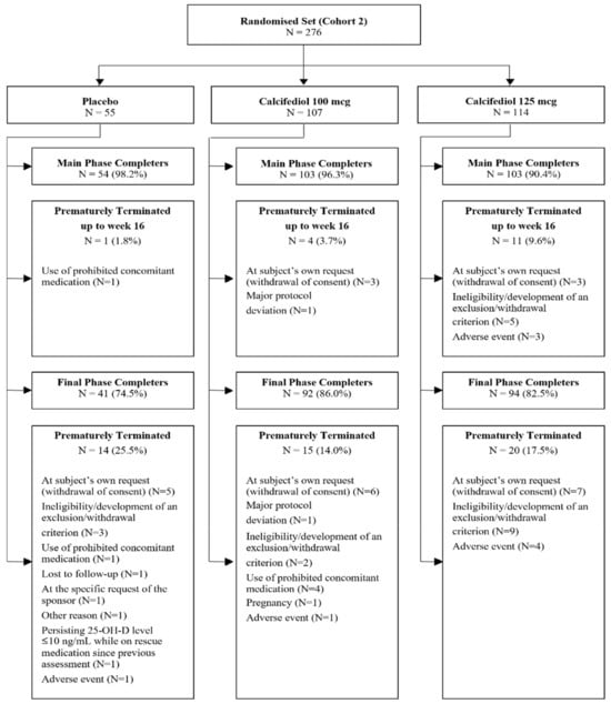 Subjects included in Cohort 2 of the study were males or females ≥18 years of age with vitamin D severe deficiency (serum 25(OH)D levels ≤ 10 ng/mL), who signed informed consent (see Supplementary Table S2 for a full description of eligibility criteria). Inclusion of patients with severe vitamin D deficiency was prematurely stopped by the sponsor. The rationale for stopping recruitment was that the study was designed pre-pandemic coronavirus disease (COVID-19). This pandemic impacted the recruitment for this study.