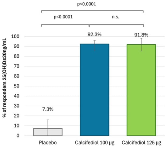 Proportion of individuals with 25(OH)D concentration ≥20 ng/mL at week 16 is shown for the placebo group (grey; n = 55), the 100 µg calcifediol group (blue; n = 104), and the 125 µg calcifediol group (green; n = 110). p-values from two-way analysis of proportions are provided. Error bars represent the 98.75% confidence intervals (CIs). n.s., non significant.