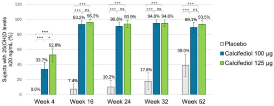 Proportion of individuals achieving a 25(OH)D concentration of ≥20 ng/mL is shown for the placebo group (grey; n = 55), the 100 µg calcifediol group (blue; n = 104), and the 125 µg calcifediol group (green; n = 110). p-values from two-sided comparisons of proportions are indicated (* p < 0.05, *** p < 0.0001, ns, non significant) and error bars represent the 98.75% CI (confidence intervals).