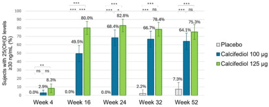 Proportion of individuals achieving a 25(OH)D concentration of ≥30 ng/mL is shown for the placebo group (grey; n = 55), the 100 µg calcifediol group (blue; n = 104), and the 125 µg calcifediol group (green; n = 110). p-values from two-sided comparisons of proportions are indicated (* p < 0.05, ** p < 0.001, *** p < 0.0001, ns, non significant) and error bars represent the 98.75% CI (confidence intervals).