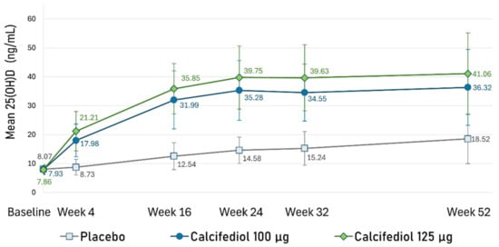 The results of this study showed that weekly supplementation raised mean 25(OH)D levels to the optimal 30 ng/mL by week 16 with levels stabilizing at week 24 and maintained through week 52. This rapid and sustained response to supplementation, characterised by an initial increase followed by a plateau, aligns with findings from several previous studies evaluating the efficacy and pharmacokinetics of calcifediol in monthly, biweekly, or daily dosing regimens (reviewed in [26,27]. All this clinical trials obtained a notable efficacy of calcifediol in achieving 25(OH)D levels above optimal 30 ng/mL, with higher levels being reached at higher doses of treatment, which is also in line with our results [28,29]. Previous trials have also demonstrated calcifediol’s efficacy in restoring 25(OH)D levels in vitamin D-deficient patients, as well as the impact of this restoration on pre-existing pathologies. They observed an improvement in physical performance, muscle strength, asthma control, and quality of life, as well as its potential benefits in managing conditions like COVID-19 complications and decompensated cirrhosis [30,31,32,33,34,35,36,37], demonstrating the advantages of calcifediol supplementation and the potential of a formulation indicated for weekly treatment in the clinical settings.