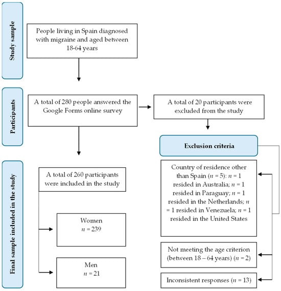The initial study sample consisted of 280 participants. At the end, the final sample included in this study was formed by 260 subjects, as those who did not meet the inclusion criteria were excluded (Figure 1).