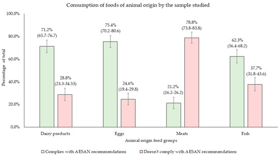 Figure 2 illustrates the average consumption of portions from different animal-based food groups compared to AESAN guidelines. The results show that 71.2% of participants adhered to recommendations for dairy intake (≤3 servings/day), 62.3% met recommendations for fish (≥3 servings/week), and 75.4% complied with egg intake guidelines (≤4 servings/week). However, 78.8% exceeded the recommended weekly intake of meat (≤3 servings/week) (Figure 2).