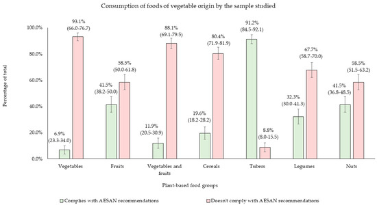 Figure 3 depicts the average consumption of portions from various plant-based food groups compared to AESAN recommendations. The findings reveal that 93.1% of respondents did not meet the daily recommended intake of vegetables (≥3 servings/day), 58.5% fell short of fruit recommendations (≥2 servings/day), and 88.1% failed to reach the combined fruit and vegetable intake target (≥5 servings/day). The consumption of legumes (≥4 servings/week), nuts (≥3 servings/week), and cereals (3–6 servings/day) were also below recommendations. The only plant-based food group meeting the guidelines was tubers, with 91.2% of participants consuming one or fewer servings per day (Figure 3).