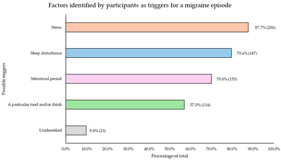 When participants were queried regarding their self-perceived susceptibility to migraine episodes under specific circumstances, a total of 90.4% (n = 235) of the respondents reported having identified one or more situations that predisposed them to migraine attacks. The most cited triggers were experiencing some form of stress (n = 206), disruptions to sleep patterns—whether due to insufficient sleep duration or lack of restorative sleep (n = 187)—and, in the case of women, the onset of the menstrual period (n = 155). Additionally, the consumption of specific foods and/or drinks was also highlighted as a self-perceived contributing factor (n = 134) (Figure 4).