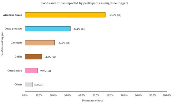 Among those participants who identified food and/or drinks as possible migraine triggers, alcoholic drinks were the most frequently reported dietary factor, cited by 56.7% of respondents. Dairy products were the second most mentioned trigger, identified by 32.1% of participants, followed by chocolate (20.9%), coffee (11.9%), and cured meat (9%). A further 5.2% of participants mentioned various other less frequently reported triggers, including onions, citrus fruits, and tea (Figure 5).