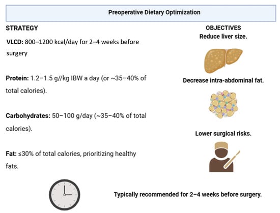 Preoperative dietary optimization: strategies and objectives for enhanced surgical outcomes. The objectives of preoperative nutrition are to reduce liver size, reduce intra-abdominal fat and decrease surgical risks [52,62,63]. VLCD: Very low-calorie diet, IBW: Ideal body weight.