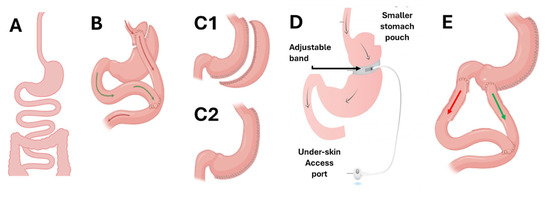 Schematic types of BS procedures. (A). Normal anatomy. (B). Roux-en-Y Gastric Bypass. (C1). Sleeve gastrectomy with excised stomach. (C2). New stomach after Sleeve gastrectomy. (D). Adjustable gastric band. (E). Biliopancreatic diversion and duodenal switch [23,24,52,63]. Red arrow: Alimentary limb. Green Arrow: Bile limb.