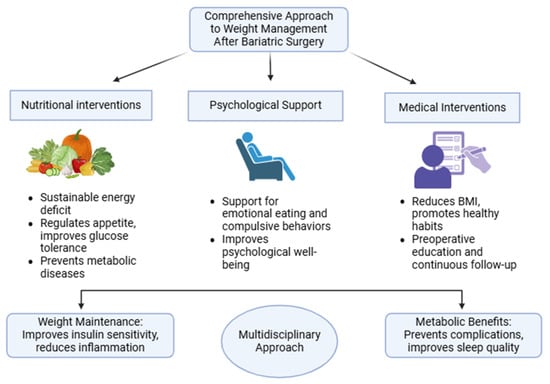 Comprehensive approach to weight management after BS [23,24,52,63]. A multidisciplinary approach is essential for the success of these interventions. This requires nutritional interventions, psychological support, and medical interventions.