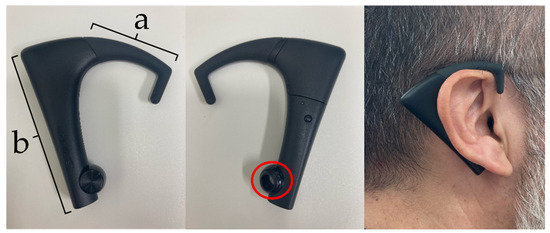 Ear-worn bite sensor (bitescan®, Sharp Corporation, Sakai, Japan). (a) Variable ear hook; (b) body. The device is designed to be worn on the right side of the head. The lower part contains a sensor (circled in red).