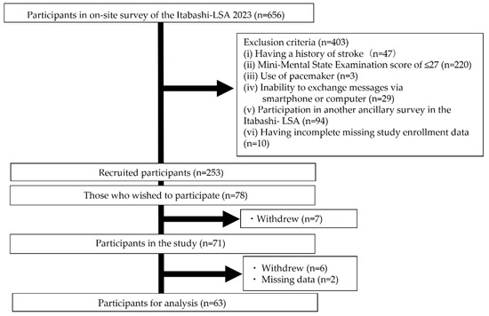 The participant recruitment process is illustrated in Figure 2. Of the 656 participants who underwent an on-site survey using the Itabashi-LSA 2023, 403 met the exclusion criteria. In total, 253 individuals were mailed to participate in the study. Of them, 78 responded positively to the invitation. After receiving a detailed explanation of the study, seven individuals declined their consent to participate. Seventy-one participants participated in this study. Excluding 6 participants who withdrew during the study and 2 who had missing data, 63 were included in the analysis (36 men and 27 women; mean age: 74.4 [standard deviation {SD} = 3.1] years) (Table 1).