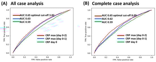 A higher AUC was observed for the highest CRP level between days 0 and 2 compared to the CRP level on day 0 and the highest CRP level between days 0 and 1, both in the all-case analysis and the complete case analysis (Figure 2). The ROC curves for the composite outcome and AUCs were calculated using the CRP level on day 0, the highest CRP level between days 0 and 1, and the highest CRP level between days 0 and 2. In the all-case analysis, the AUCs were 0.59, 0.63, and 0.65, respectively. In the complete case analysis, the AUCs were 0.59, 0.62, and 0.65, respectively. The optimal cut-off was 3.82 mg/dL in the all-case analysis and 8.09 mg/dL in the complete case analysis.