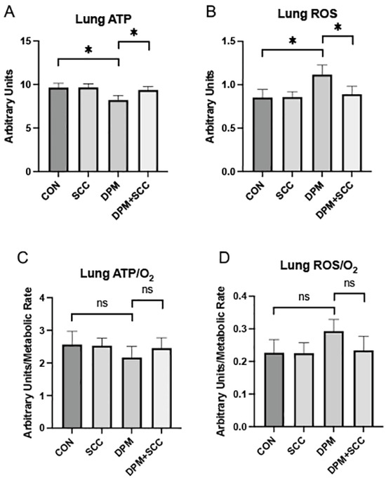 (A) Lung ATP levels across treatment groups. DPM treatment significantly decreased ATP synthesis compared to CON, and DPM+SCC significantly mitigated DPM-mediated ATP deficits (* p ≤ 0.05). (B) Reactive oxygen species (ROS) levels in the lung. ROS were elevated in DPM animals, and ROS in DPM+SCC returned to levels observed in CON (* p ≤ 0.05). (C) ATP/O2 metabolic efficiency was not significantly different (ns) when comparing any of the groups. (D) ROS/O2 levels were also not significantly different (ns) among any of the groups.