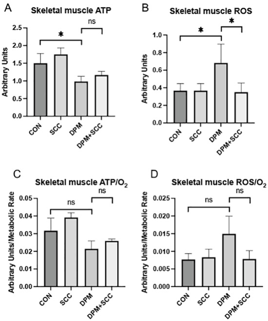 (A) ATP levels were significantly reduced in skeletal muscle from the DPM group compared to CON (* p ≤ 0.05). However, no significant difference in ATP abundance was observed when comparing DPM+SCC and DPM groups. (B) Skeletal muscle ROS levels were significantly elevated in DPM mice compared to CON, and DPM+SCC experienced significantly less ROS compared to the DPM group (* p ≤ 0.05). (C) Skeletal muscle ATP/O2 efficiency was not significant different (ns) when comparing CON vs. DPM or DPM vs. DPM+SCC. (D) Skeletal muscle ROS/O2 levels were also not significantly different (ns) when comparing CON vs. DPM or DPM vs. DPM+SCC.