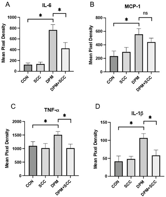 (A) IL-6 levels were markedly increased in DPM mice compared to CON, and DPM+SCC mice secreted significantly less IL-6 levels compared to mice exposed to DPM alone (* p ≤ 0.05). (B) MCP-1 levels were significantly elevated in DPM mice compared to CON (* p ≤ 0.05), and although MCP-1 levels in DPM+SCC mice trended downward, the change was not significantly different (ns). (C) TNF-α abundance was significantly increased in DPM mice compared to CON, and DPM+SCC significantly diminished TNF-α compared to DPM alone (* p ≤ 0.05). (D) IL-1β was significantly elevated in the DPM mice compared to CON mice, and DPM+SCC mice secreted significantly less IL-1β compared to DPM alone (* p ≤ 0.05).