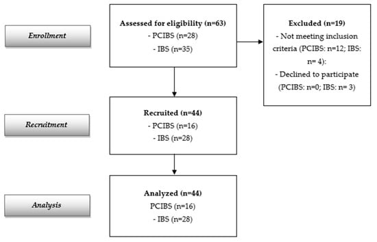 The flow diagram reported in Figure 1 indicates 63 screened participants (28 with PCIBS and 35 subjects with IBS without previous COVID-19 infection). Forty-four subjects were recruited and analyzed (16 with PCIBS and 28 subjects with IBS without previous COVID-19 infection, considered as the control group). The recruited population at baseline is described in Table 1. The data show a total of 44 recruited adults, 28 females and 16 males (mean age: 44.59 ± 16.20 years); 16 were in the PCIBS group and 28 were in the control group. All of them completed the study. Baseline demographic and clinical characteristics were similar in both groups. Only the abdominal bloating score differed at baseline between the two cohorts, although this was the major symptom in both groups.