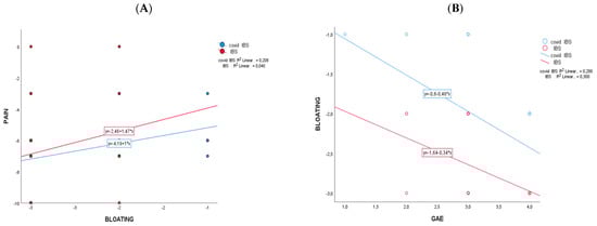 Pearson correlations between Δ-changes (end vs. baseline) on the two cohorts that changed significantly. In (A) is pain versus bloating and in (B) is bloating versus GAE.