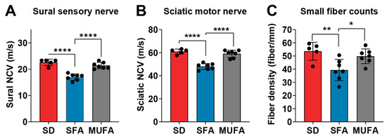 MUFA diet protects against SFA-induced PN in mice. WT mice aged 6 weeks received a standard diet (SD, red) or saturated fatty acid (SFA)-rich diet (SFA, blue) for 10 weeks. Half the SFA mice were then placed on a diet rich in monounsaturated fatty acids (MUFA, gray) for 8 weeks while the remaining mice stayed on their respective diets. Terminal assessment of large fiber neuropathy by (A) sural sensory and (B) sciatic motor nerve conduction velocity (NCV). (C) Terminal assessment of small fiber neuropathy by intraepidermal nerve fiber density. Black circles represent individual animals. All data presented as mean ± standard deviation; n = 5–7 mice per group; * p < 0.05, ** p < 0.01, **** p < 0.0001 for SD vs. SFA; SFA vs. MUFA; one-way ANOVA with Tukey’s multiple comparisons test. Figure adapted ref. [4].