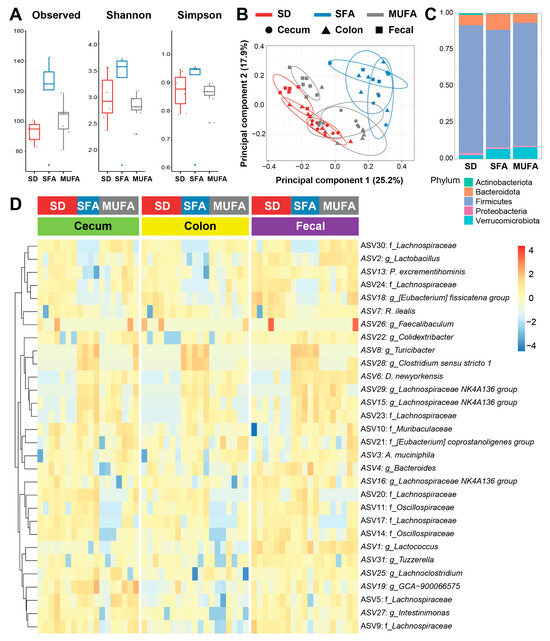 We next addressed whether the differential effects of an SFA- versus MUFA-rich diet on PN are linked to gut microbiome changes. First, we assessed alpha diversity, a measure of within-sample microbial diversity. We found site-specific alpha diversity in cecum, colon, and fecal samples that were significantly higher than in ileum samples (Supplementary Figure S1A), as aligned with the literature [30]. Since ASV counts in the ileum were low, they were only analyzed for alpha diversity. We found that alpha diversity in the cecum, by observed counts, was significantly higher in the SFA-rich diet versus SD mice (Supplementary Figure S1B). MUFA alpha diversity levels were commensurate with SD mice. The pattern of higher alpha diversity in the SFA versus SD and MUFA microbiome persisted by the Shannon and Simpson indices, albeit non-significantly. Although alpha diversity was higher in SFA versus SD and MUFA colon (Supplementary Figure S1C) and fecal samples (Figure 2A), these differences were not significant.