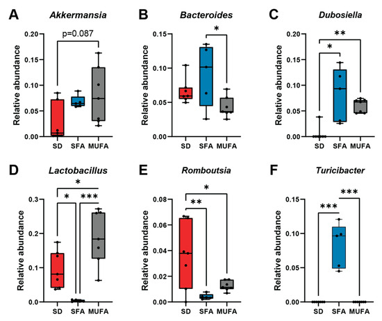 Different fatty acid-rich diets associated with differential fecal bacterial genera abundance. (A–F) Relative abundance of the most and differentially abundant genera in fecal microbial samples from the standard diet (SD, red, n = 7), saturated fatty acid-rich diet (SFA, blue, n = 5), and monounsaturated fatty acid-rich diet (MUFA, gray, n = 7) mice. Data in box plots represented with horizontal line for median, box for first and third quartiles, and whiskers for minimum and maximum values. Black circles represent individual animals. * p < 0.05, ** p < 0.01, *** p < 0.001; Kruskal–Wallis with Dunn’s multiple comparisons test for panels (A, C, and F); one-way ANOVA with Tukey’s multiple comparisons test for panels (B, D, and E).