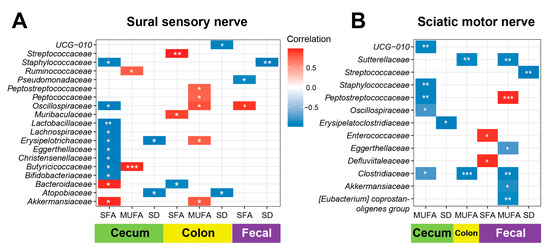Sural and sciatic nerve conduction velocities correlate with distinct microbiota families in different fatty acid-rich diet mouse groups. Heatmap of Pearson correlation analysis of (A) sural sensory and (B) sciatic motor nerve conduction velocities to family taxa in cecum (green), colon (yellow), and fecal (purple) microbial samples from standard diet (SD, n = 7), saturated fatty acid-rich diet (SFA, n = 4–5), and monounsaturated fatty acid-rich (MUFA, gray, n = 7) mice. Legend indicates negative (blue) and positive (red) correlations. Unadjusted p-values, * p < 0.05, ** p < 0.01, *** p < 0.001; Pearson correlation analysis.