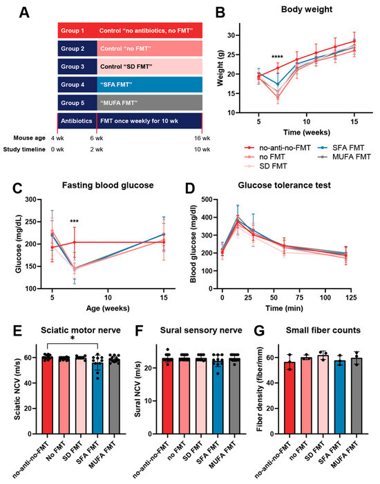 Different FMT transplants do not substantially affect metabolic and PN phenotypes in recipient mice. (A) FMT study design and mouse groups. Longitudinal (B) body weight and (C) fasting blood glucose levels for all mouse groups at study start (aged 5 weeks), after microbiota depletion (aged 7 weeks), and towards study end (aged 15 weeks). (D) Blood glucose levels following glucose tolerance test for all mouse groups towards study end (aged 15 weeks). Data presented as mean ± standard deviation; n = 11–12 mice per group; *** p < 0.001, **** p < 0.0001 for “no antibiotics, no FMT” versus other groups, otherwise few other statistically significant between-group differences; two-way ANOVA with Dunnett’s multiple comparisons. Terminal assessment of large fiber neuropathy by (E) sciatic motor and (F) sural sensory nerve conduction velocity (NVC). Data presented as mean ± standard deviation; n = 10–12 mice per group; * p < 0.05 for “no antibiotics, no FMT” versus SFA FMT, Kruskal–Wallis with Dunn’s multiple comparisons. (G) Terminal assessment of small fiber neuropathy by intraepidermal nerve fiber density. Black circles represent individual animals. Data presented as mean ± standard deviation; n = 3 mice per group; Kruskal–Wallis with Dunn’s multiple comparisons. No-anti-no-FMT, no antibiotics, no FMT; no FMT, no fecal microbiota transplant; SD FMT, standard diet FMT; SFA FMT, saturated fatty acid FMT; MUFA FMT, monounsaturated fatty acid FMT.